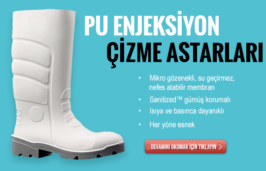 - PU (Poliüretan) Enjeksiyonlu Botlar için iki yönden elastik, PU (poliüretan) membran laminasyonlu – nefes alabilir koruyucu kumaşlar